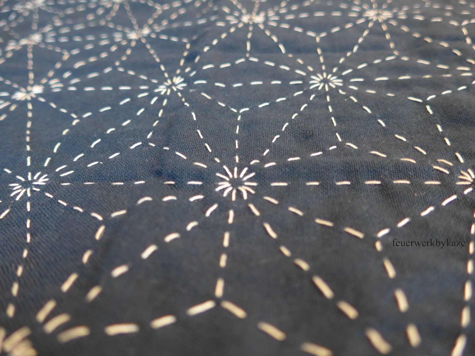 Zu Zeiten, als das Wünschen noch half, habe ich auf der Textil-ART Berlin zwei original japanische Sashiko-Stoffstücke erworben. Aus purer Neugierde und Lust am Probieren, denn natürlich kann man diese Muster auch selber aufzeichnen. Da alle Muster dieser Art aus unterbrochenen Linien bestehen, fand ich, passt es hervorragend zum Januarthema unserer Stoffspielerei.